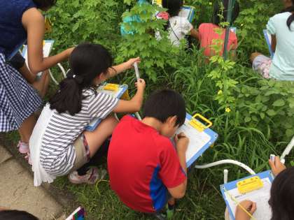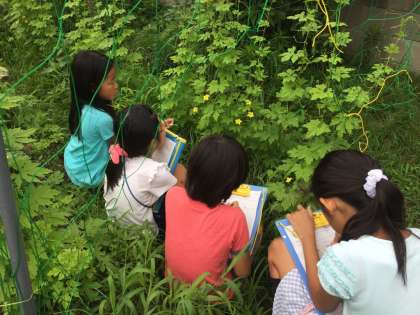 5月に植えたツルレイシの種が、今では大きく成長しました。黄色いきれいな花だけでなく、よーく見ると小さな実もできていました。においを嗅いでみると、ほんのり苦いゴーヤのにおいがしたようでした。