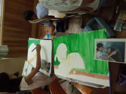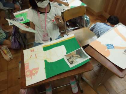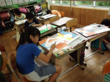 図画工作科で取り組んでいる「計量の図画展」に向けての作品作り。絵の具を使っての色付けに進みました。「絵の具は必ず混ぜる」「筆の向きをそろえる」など,ポイントに気をつけて色付けしていきました。