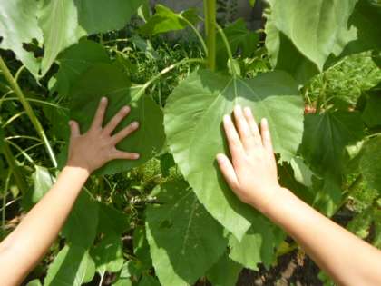 葉がてのひらより大きいよ!高さが,わたしたちの背より高いよ!