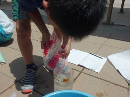 子ども達は,自分が1リットルと思う分量を袋に水を入れ,1リットルますではかってみました。1リットルよりも少ない分量を入れる子ども達が多かったです。