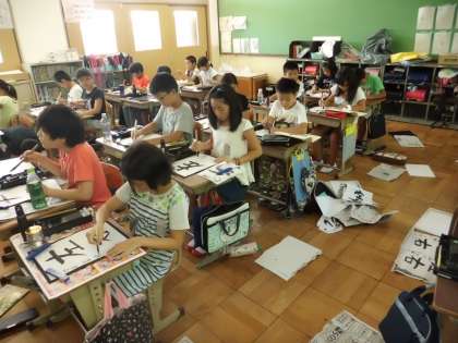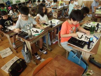 書写では「筆順と字形」の単元で「左右」の字を書きました。左と右の筆順を確認した後,2つの字形が正反対の字形をしていることをとらえました。そして,姿勢を整えながら,筆順と字形に気をつけて書いていきました。