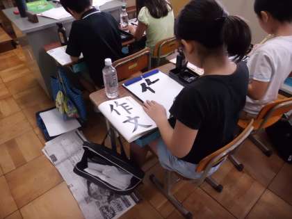 書写では「点画の接し方・交わり方」の単元で「作文」の字を書きました。「作」の四画目と五画目の接する位置や「文」の三画目と四画目は中心で交わることを意識して,書き進めていきました。