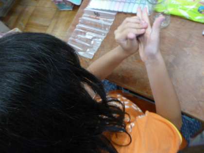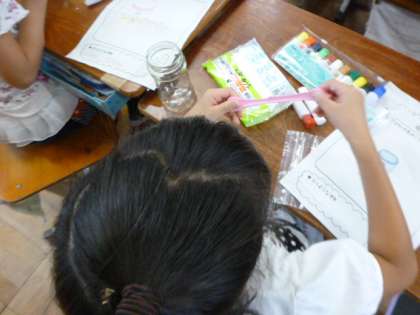 紙粘土に絵の具を混ぜて,家で用意をしてもらった空き容器にはりつけていきました。
