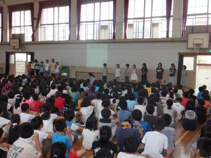 9月5日(月)に朝会がありました。環境委員会や図書委員会からの発表がありました。それぞれの委員会の子ども達が,リサイクルのことや読書月間の取組について発表しました。
