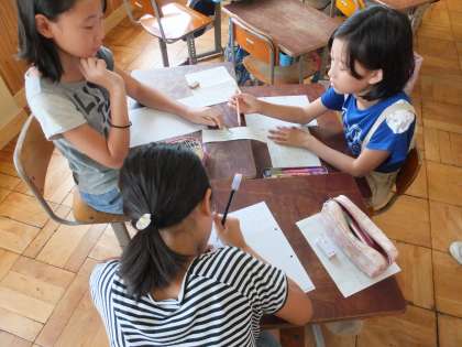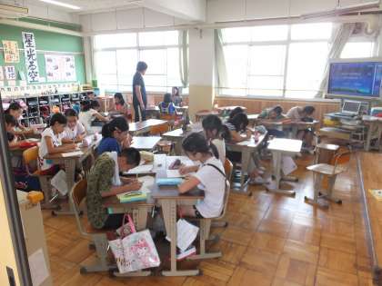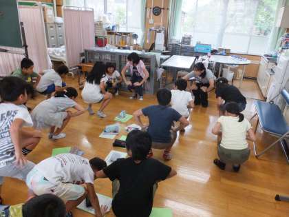山の家に向けての係活動では班長は出発式や入所式,各活動前のあいさつなどの準備を進めています。食事係では,野外炊事をスムーズに行えるように注意事項を出し合い,レクリエーション係はキャンプファイヤーの準備を,保健係では健康観察の注意点や,朝の体操などの準備を進めています。