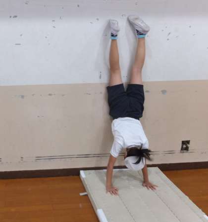 ねらい2の時間では,ゴムを使って側転の足が高く上がっているかを確かめたり,ロールマットを跳び越えるようにして跳び前転の感覚をつかんだり,壁を使って倒立の練習をしたり,一人一人がめあてをもって活動しています。