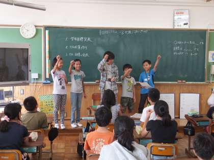 山の家の学年目標が決まりました。「勇気を出してチャレンジ&元気にあいさつ」です。その学年目標を受けて,各班ごとに班の目標を決めて発表し合いました。協力をテーマにする班,チャレンジをテーマにする班など,班によって思いのこもった目標を発表しました。