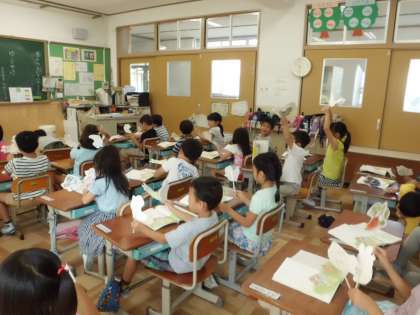 国語科の「ゆうやけ」の学習では,登場人物のペープサートを動かしながらお話を味わいました。登場人物になりきってセリフを言ったり,お話の内容に沿って動かしてみたりしながら,たっぷりと「ゆうやけ」の世界にひたることができました。