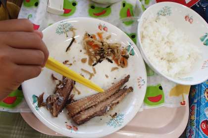 さんまのしょうが煮は,釜でコトコトたいて,実にすっとお箸が入るくらいやわらかくたきあがりました。子どもたちは,上手にお箸を使って,身を切り分けて食べていました。