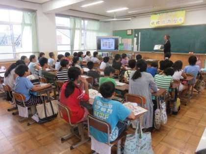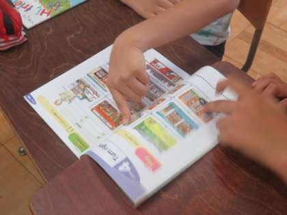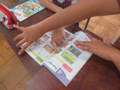 「park」「flower shop」「hospital」「bookstore」「restaurant」 など,子どもたちは建物のいい方を学習しました。その後,「Go straight」「 Turn right」など,方向を指示する語を聞き取って,どの場所にたどり着いたか考えました。