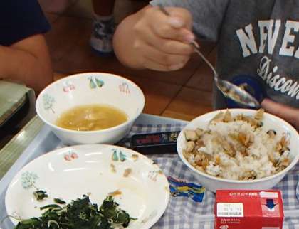 教室で子どもたちがそれぞれ具をご飯に混ぜていただきます。