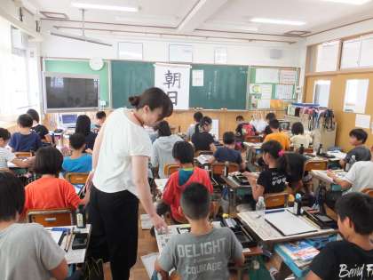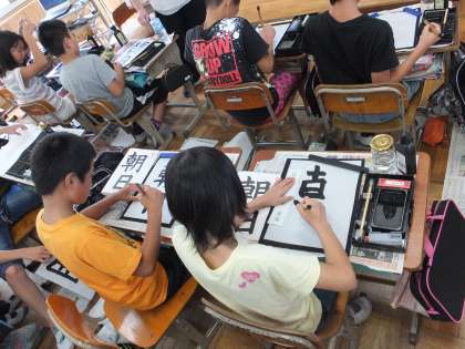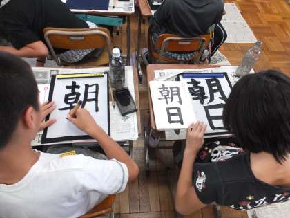 5年生の書写の学習で「朝日」に取り組みました。半紙に「朝」の字と「日」の字のバランスを考えて書いていきます。お手本を良く見て集中して書くことができています。