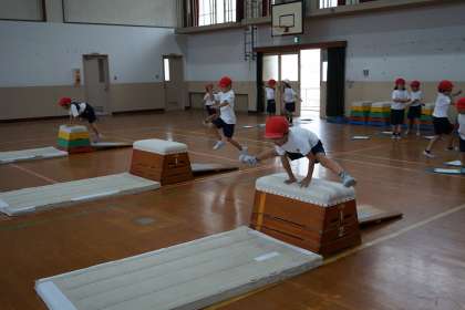 勢いよく踏みこむことや,手を遠くにつくことなど,上手に跳ぶコツをつかんで何度も何度も練習をしています。