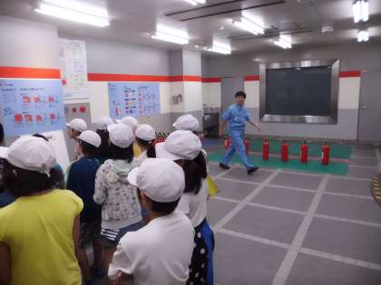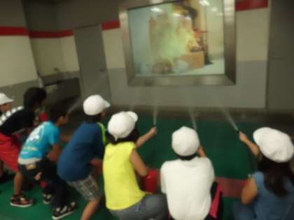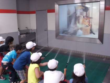 ここは消火体験室。火事を発見したときに消火器を使って素早く消火する体験をしました。