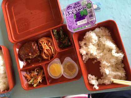 メニューは,ハンバーグランチ。たくさんの子どもたちが,おかわりをしていました。