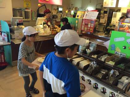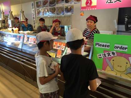 お腹も空いてきたのでお昼ご飯にする班もいくつか出てきました。伊勢うどんセット、カツカレー、ラーメンセット、ハンバーグセットから選び、自分たちで注文とクーポンを使った会計をしました。
