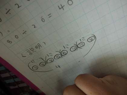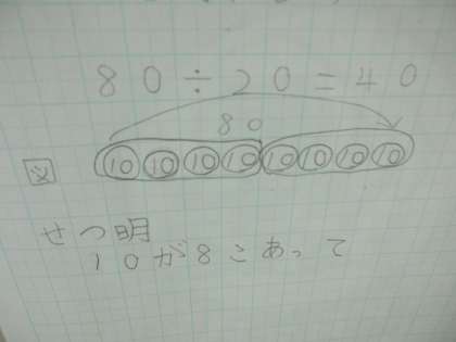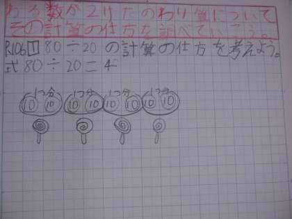 算数科では「2けたでわるわり算の筆算」の学習がスタートしました。「80円で20円のあめがいくつ買えるのか」について,絵を使って説明する子どもたち。8枚の10円玉を2枚ずつに分けることから,答えが4であることを導き出しました。筆算の方法を身につけるだけでなく,「2けたでわる」とはどういうことなのか,基本的なことから学習しています。