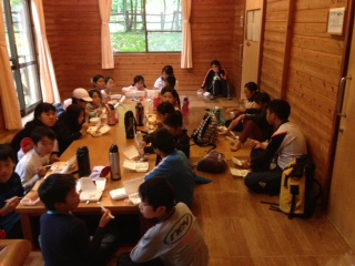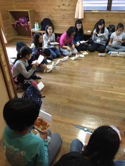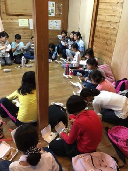 昼食中です。登山後なので,みんなモリモリ食べてます。唐揚げが美味しいとのことです。