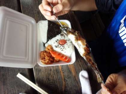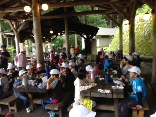 捕まえた魚をさばいて,炭火で焼けたら,おにぎり弁当と一緒にいただきます。塩加減がよくて、とてもおいしいです。自分でさばいた魚はとても美味しかったようで,「最高!」「めちゃおいしい」と満足そうです。