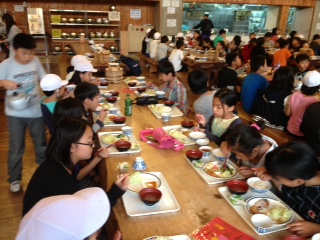 山の家最後の夕食です。キャンプファイヤーに向けて,英気を養いました。串カツやシューマイ,春雨サラダが人気です。