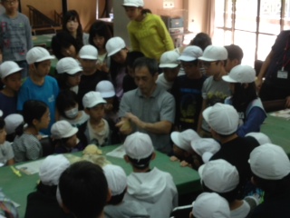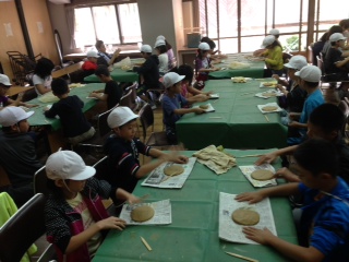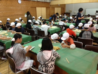 山の家の師匠から花背焼きの説明を受けました。粘土が空気に触れて固まるまでに形を決めて器を形作り,字を書いたりデコレーションをしたりします。師匠から見本を見せてもらって,いよいよ作業開始です。