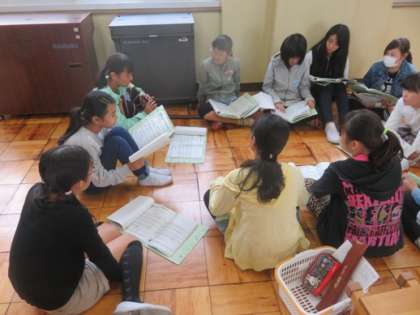 はじめに,「マ」でのばしてそれぞれのパートの音を確かめました。次に,三分合唱のパーレに分かれ,パート練習をしました。最後に,全体で合わせて三部合唱の響きを感じながら合唱しました。