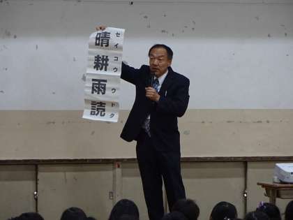 校長先生から「晴耕雨読」の意味を教えていただき,自分で考え,判断し,行動することを大切にしていこうというお話を聞きました。