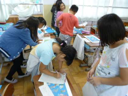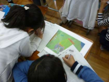 色や登場人物の大きさや場所などに注目して絵をみました。