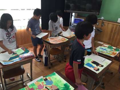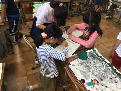 図工で描いた「お話の絵」の鑑賞を行いました。友達の作品を見て、工夫したところや頑張ったところを見つけました。色の使い方や、構図についての工夫や頑張りに気付いている人がたくさんいました。