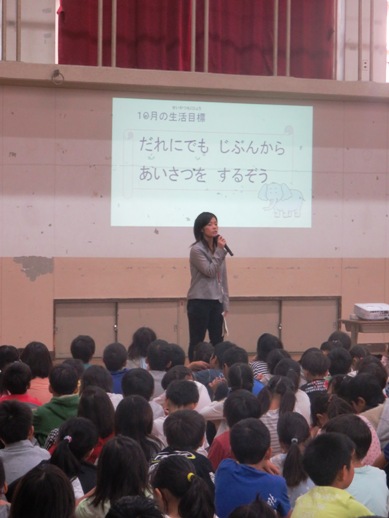 10月の生活目標は,「だれにでも じぶんから あいさつするぞう」です。毎日の振返りで,いろいろな先生や同じマンションの人,地域の人などに自分から挨拶をすることができたという声が増えてきました。