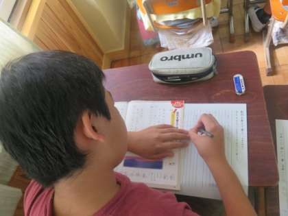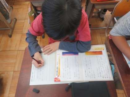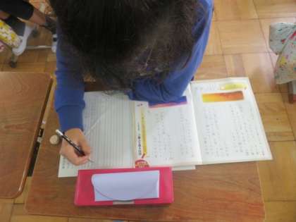 書写の学習で,「枕草子」の一節を鉛筆で書きました。行の中心と余白のとり方に気を付けて書くことをがんばっていました。