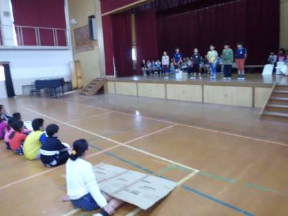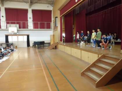 学習発表会に向けて,全グループが集まっての通し練習をしました。舞台の上での動き方や位置などを確かめました。また,他のグループを見ることで,自分たちのグループの発表にも生かしていこうとする姿勢が見られました。