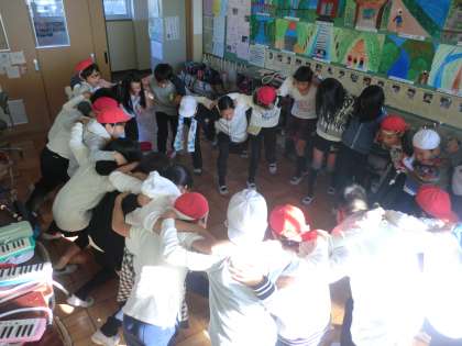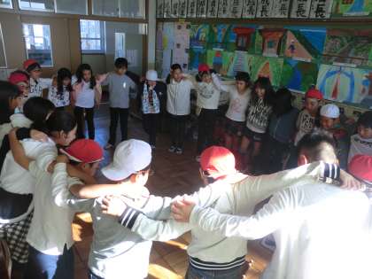 子どもたちは教室で円陣を組み,