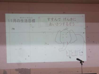 11月の生活目標は,「すすんで げんきに あいさつするぞう」です。10月で地域の人や友達などだれにでも自分から挨拶することをがんばっていた子ども達。