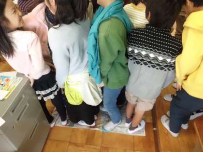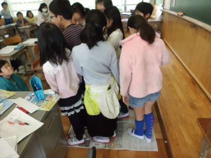 算数科「面積」では,1平方メートルの新聞紙を用意し,どれだけの人が乗れるかに挑戦。1平方メートルの広さとはどんなものか,体感することができたようです。