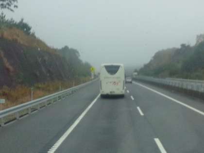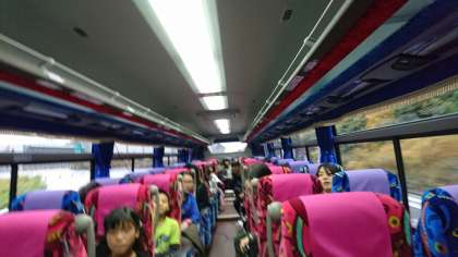 バスの中では,レクリエーションを楽しみながら移動しています。現在,クイズをしたり誰でしょうゲームをしたりしています。お天気は曇りです。