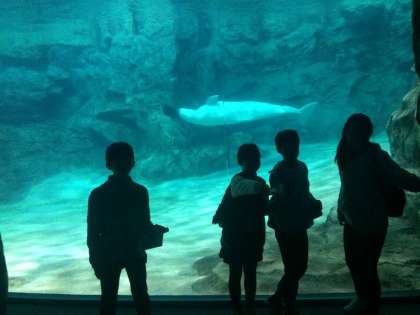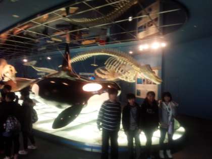 水族館に着きました。クラス写真を撮った後,グループごとに館内を回ります。白イルカも見ることができました。