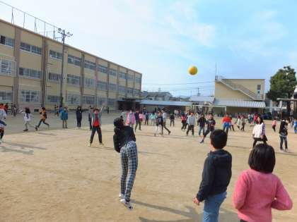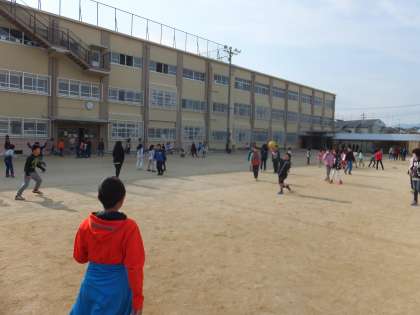 中間休みにみんな遊びでドッジボールを行いました。今回はコートを広めに取ったので,なかなか当てることが難しかったようです。