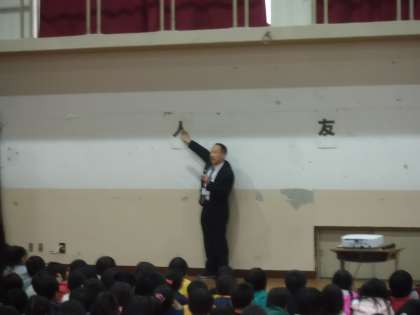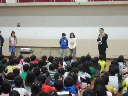 11月14日(月)に朝会がありました。大文字駅伝や柔道大会などでがんばった人たちを校長先生が紹介されました。また,校長先生からは,人を大切にするということについて,歌を交えてお話し下さいました。