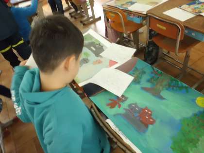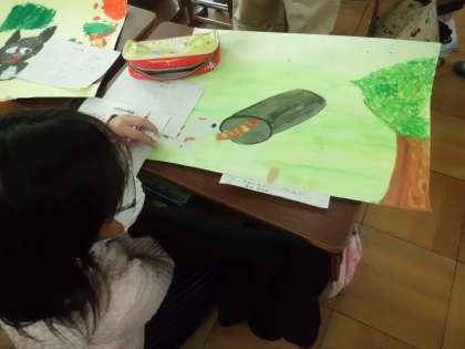 図画工作科「大好きな物語」でかいた作品を交流しました。友だちのよさを見つけては,意欲的に記録していく姿が見られました。