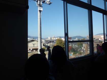11月18日(金)の朝に西に沈もうとする半月を発見!子どもたちは,こぶしいくつ分になるのかを測っていきました。