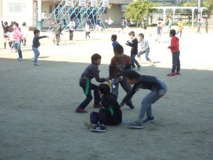 みんな遊びではタグ取りをしました。取って取られての大乱戦に,子どもたちも大興奮!