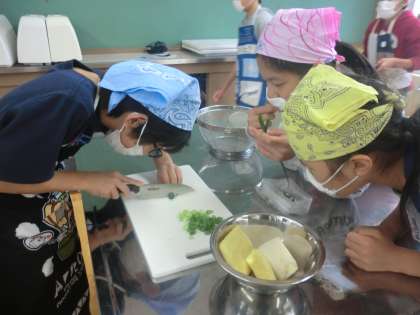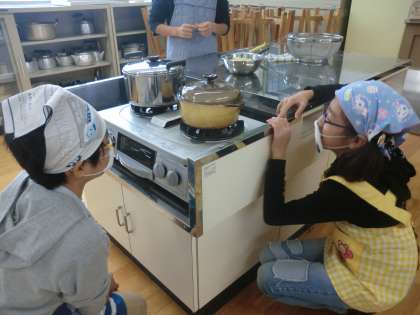 みんなで協力しながら野菜を切ったり,ガラスなべの