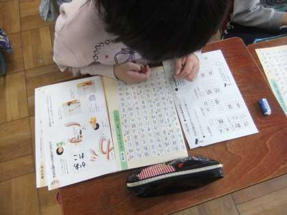 書写で,漢字の組み立てについて学習しました。漢字には,へんとつくりに分かれる左右型や,上下型,門などのかまえ型,庭などのたれ型などがあります。漢字がもついろんな形に気をつけて丁寧に書きました。