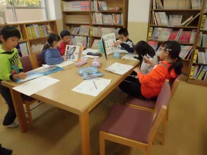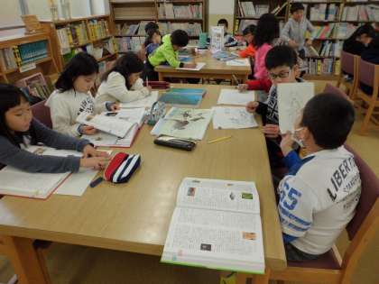 版画をするために,図書室で調べながら