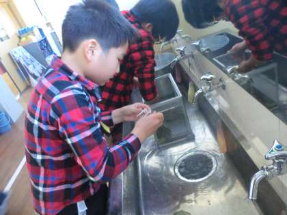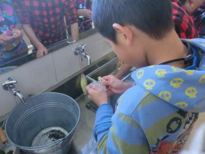昼休みに生き物係の人たちが金魚の水槽の水かえ