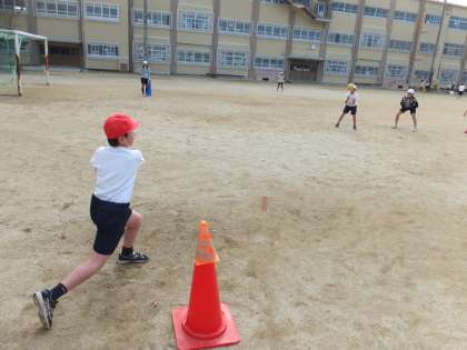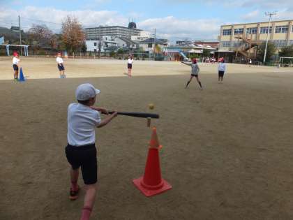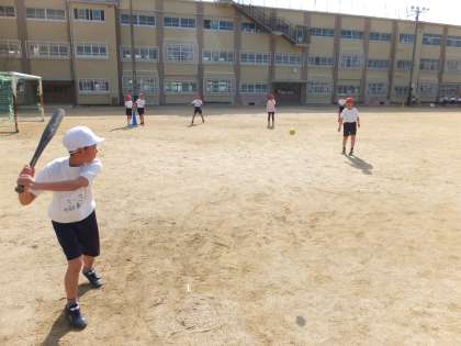 5年生の体育の学習でベースボールに取り組んでいます。打ち方や守り方を工夫するだけでなく,敵味方にかかわらずいいプレーを褒めたり,失敗しても励まし合ったりする姿がたくさん見られます。次の人にバットを渡したり,ティの用意をしたり,クラスのみんなで協力してゲームを進めています。