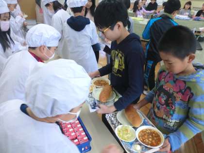 給食当番さんに料理をもらいます。