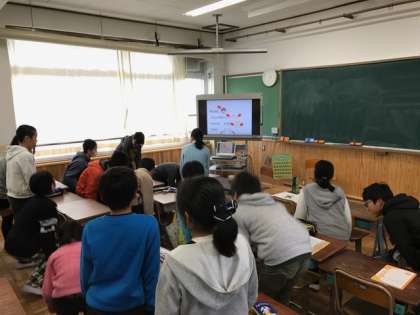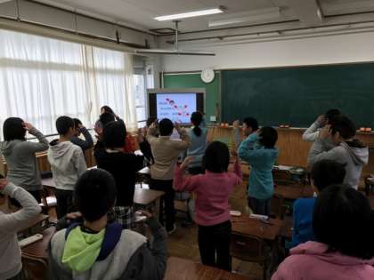 毎週火曜日は,掃除時間後の帯時間,どんどんタイムに英語のゲームや歌を歌っています。1月は,Head shoulders knees and toesです。歌いながら頭や肩,ひざ,つま先をリズムに合わせて触ります。だんだん速くなる歌に必死で楽しみながらついていく子どもたちでした。