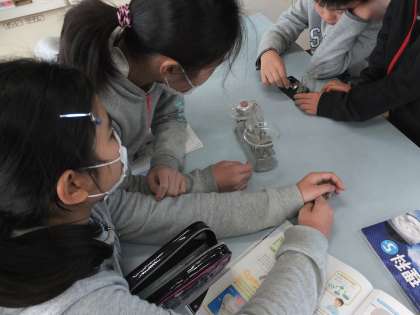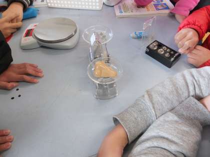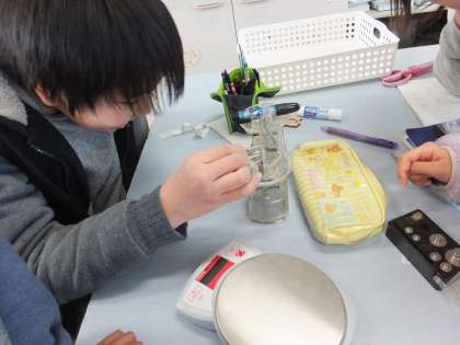 5年生の理科の学習で,上皿てんびんや分銅の使い方を学習しました。片方の上皿に測りたいものを乗せ,もう片方の上皿に分銅を乗せていきます。どのくらいの重さで釣り合うのか予想を立ててから繰り返し重さを量っていました。